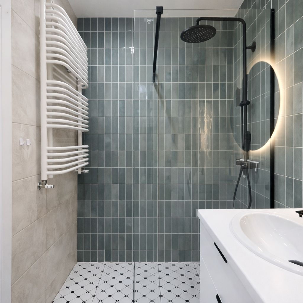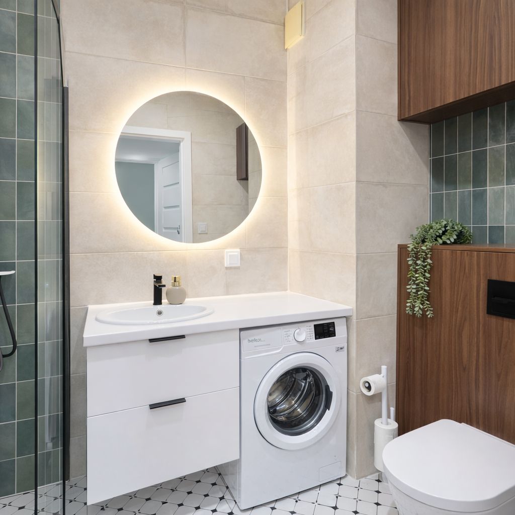 nowoczesna łazienka z bezprogową kabiną prysznicową oraz pralką,