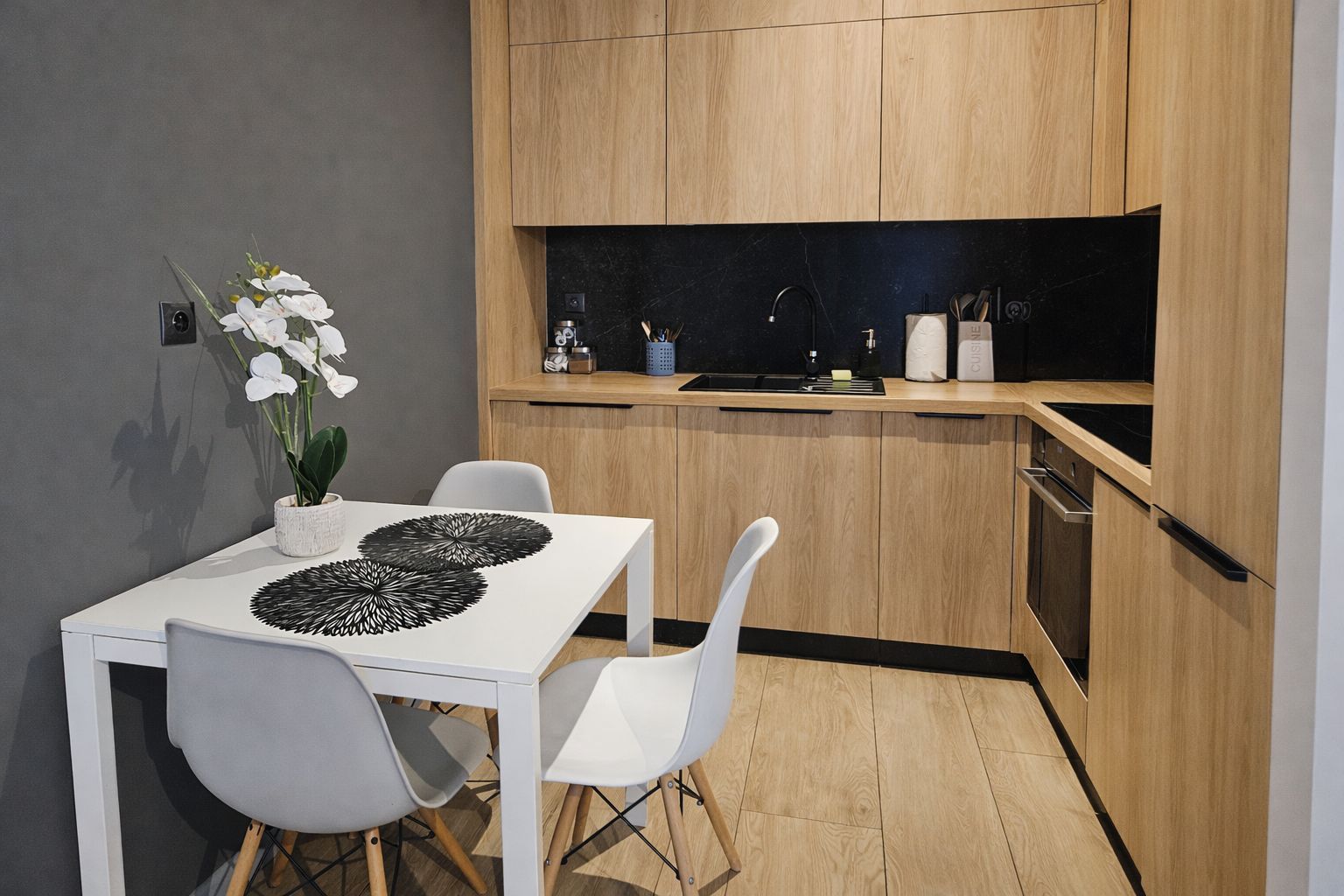 Aneks kuchenny jest w pełni wyposażony i umożliwia komfortowe przygotowywanie posiłków. Do dyspozycji Gości jest m.in. duża lodówka z zamrażalnikiem, płyta indukcyjna, piekarnik, zmywarka, a także komplet naczyń i akcesoriów kuchennych.