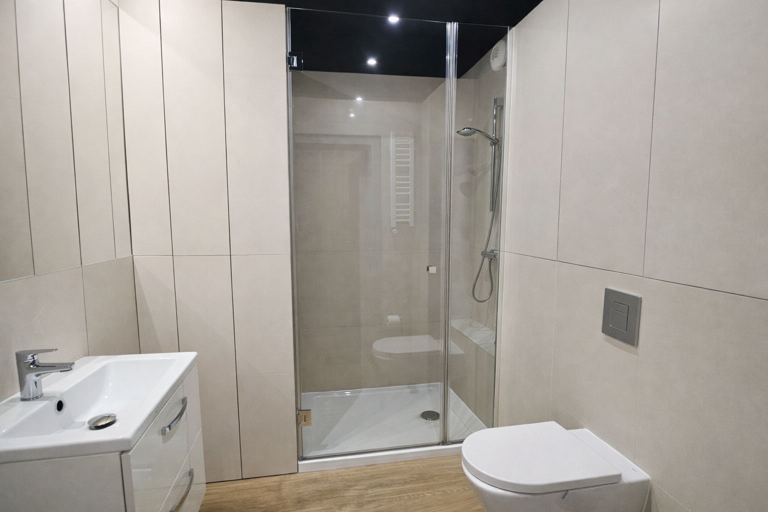 Łazienka została wyposażona w bezprogową kabinę prysznicową, pralkę oraz suszarkę do włosów, co czyni apartament wygodnym również przy dłuższych pobytach.